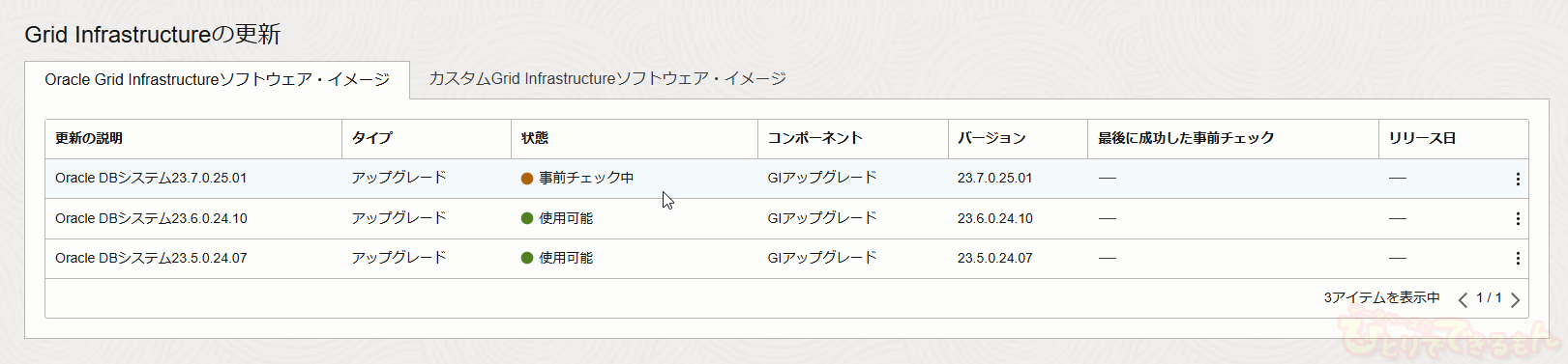 [更新] ページを確認すると、「Grid Infrastructureの更新」のリストから、アップグレード後のバージョン以前のアイテムがなくなっています。