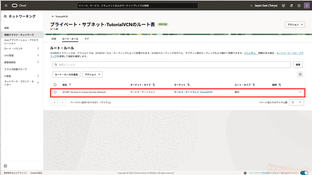 これだけでは意図した接続方法を使用しているのか分からないため、サービス・ゲートウェイをターゲットとするルート・ルールを削除して再度実施します。