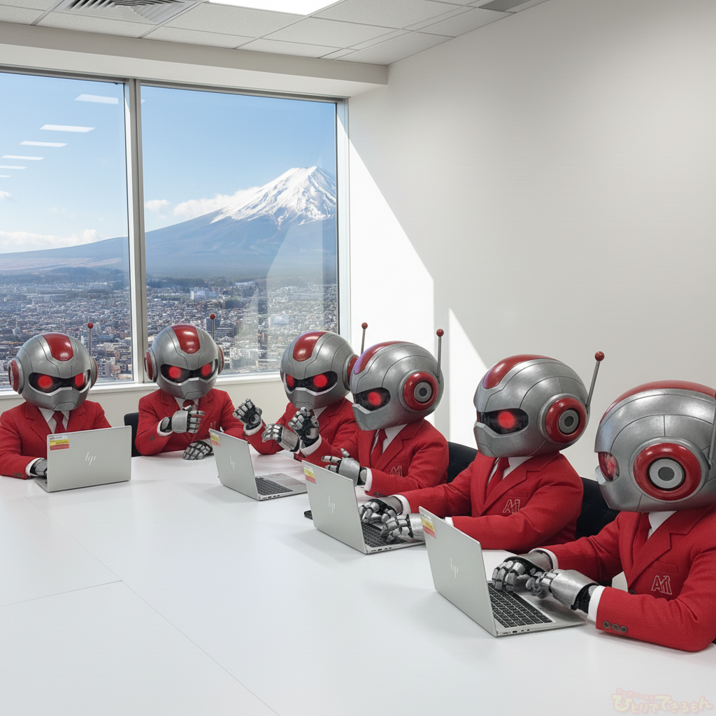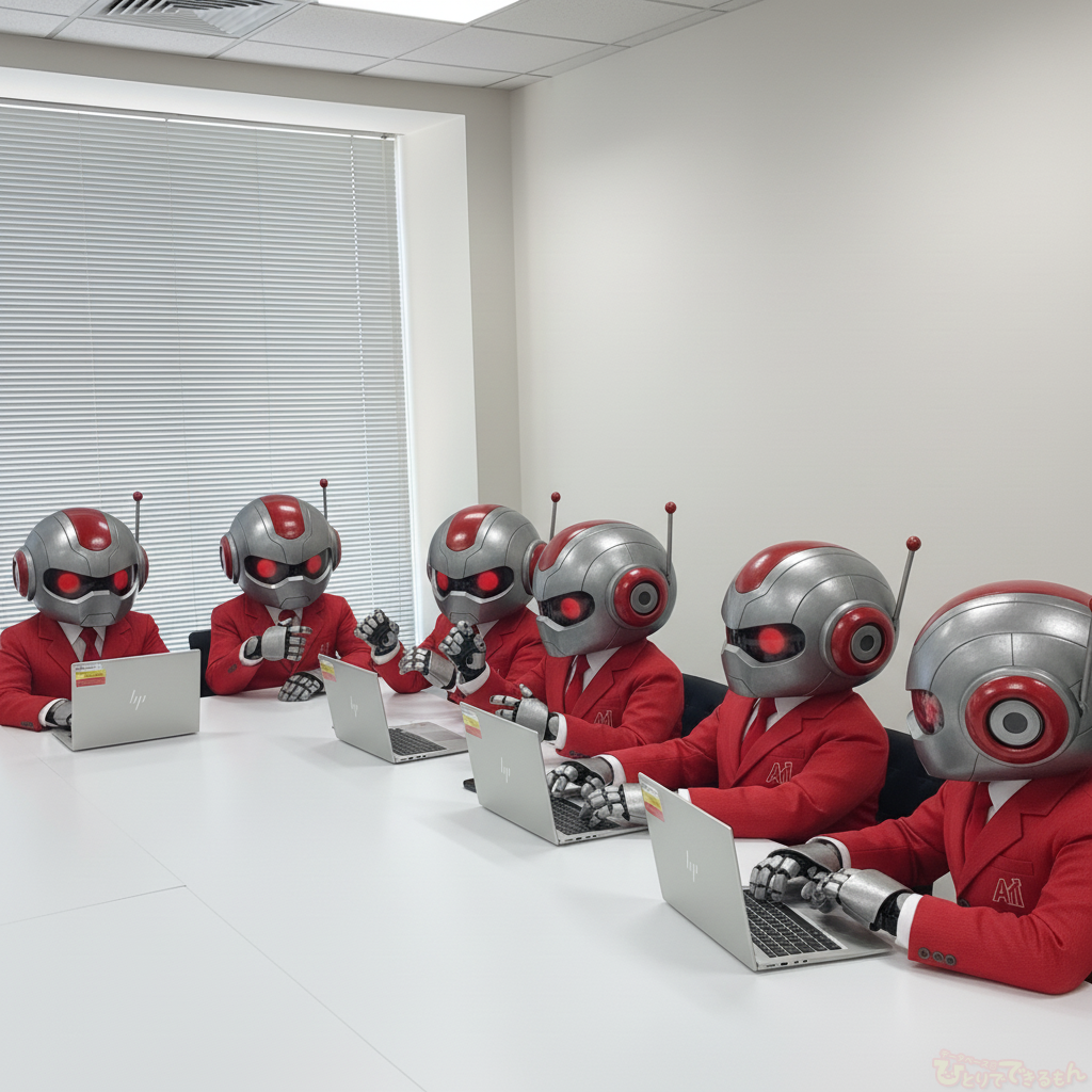 プロンプトは「テーブルのすべての席に同じロボットが座っている。ロボットたちは会議中で議論している」で送信してみます。