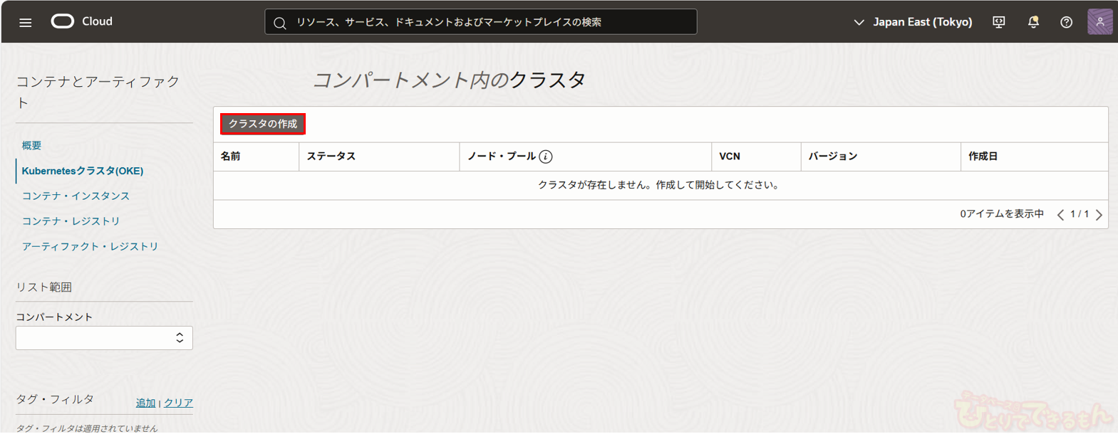 「コンテナとアーティファクト」→「Kubernetesクラスタ(OKE)」へ移動します。 - 「クラスタの作成」をクリックします。