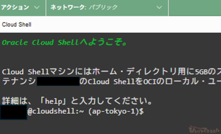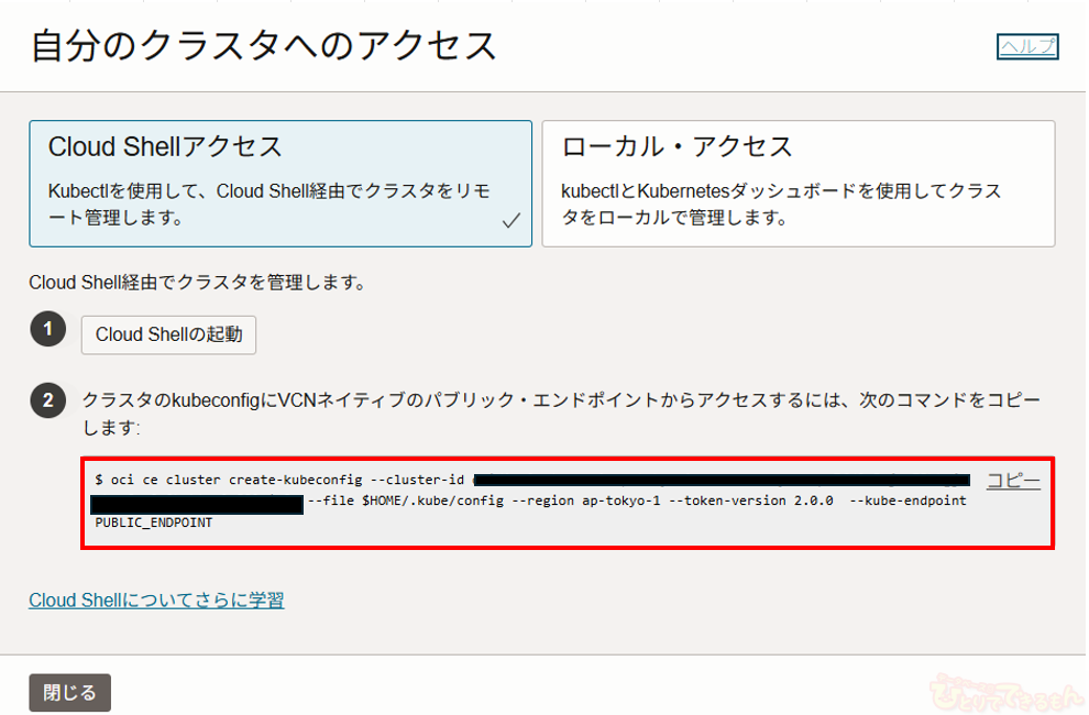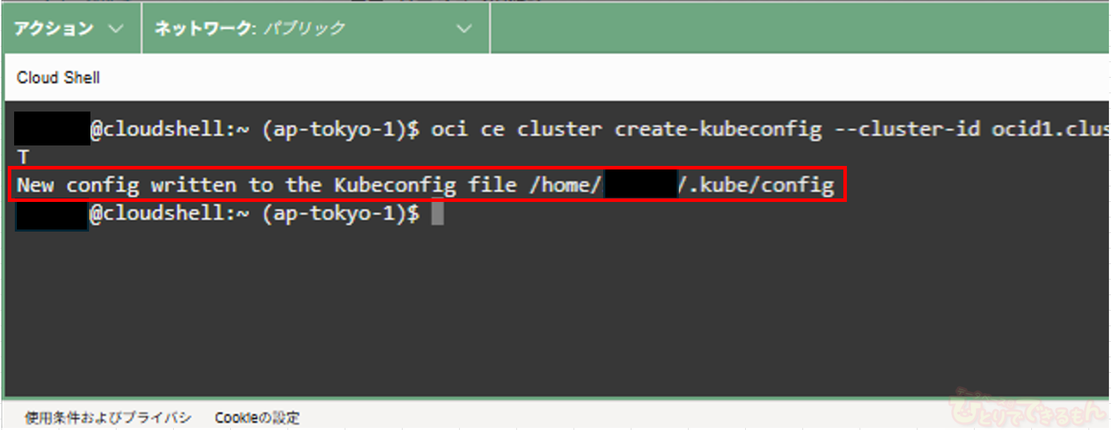 「②クラスタのkubeconfigにVCNネイティブのパブリック・エンドポイントから~」から始まる項目でメモしたコマンドを貼り付けてコマンドを実行します。