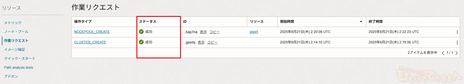 「操作タイプ」のステータスの状態がが「成功」と表示されるまで待ちます。 - 正常にKubernetesクラスタが作成されると、以下にて新規にリソース