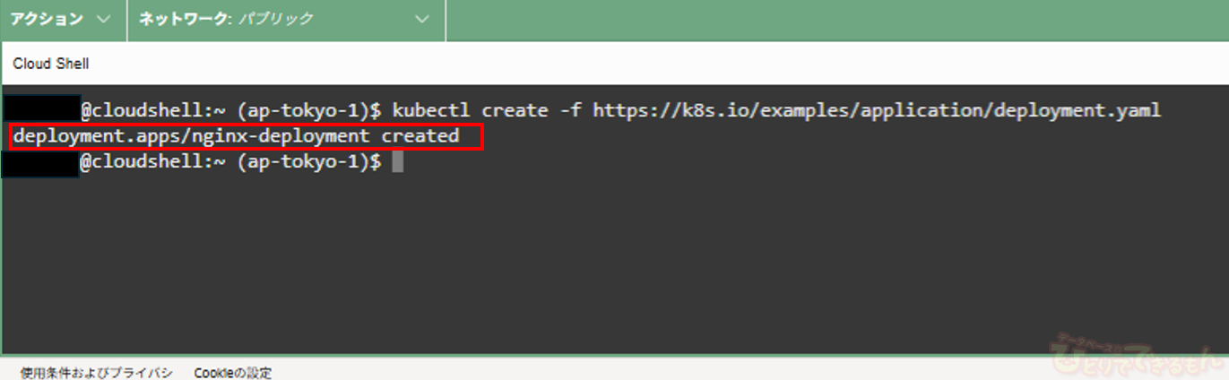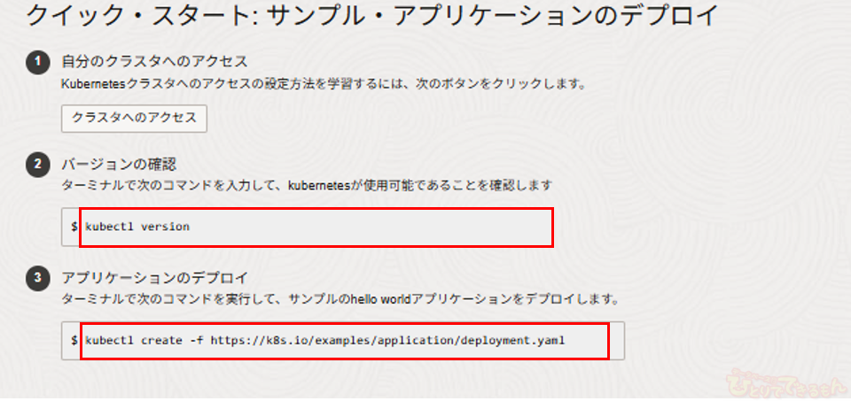 - 「③アプリケーションのデプロイ」でメモしたコマンドを実行し、サンプルのhello worldアプリケーションを新規に作成します。