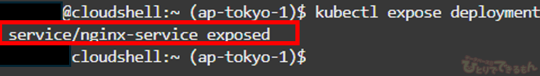 「service/nginx-service exposed」というメッセージが表示され、外部に公開するようになります。$ kubectl expose deployment nginx-deployment --type=LoadBalancer --port=80 --target-port=80 --name=nginx-service