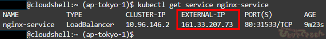 ※EXTERNAL-IPが表示されない場合は数十秒待った後にコマンドを実行します。$ kubectl get service nginx-service