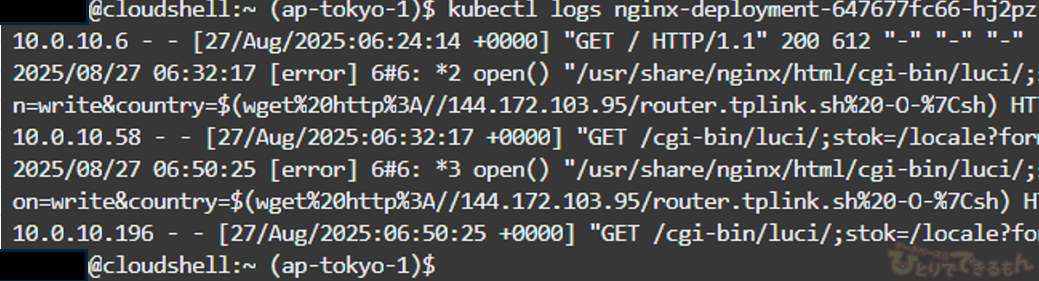 ようこそ画面が表示されます。 - Cloud Shellに戻り、Podが正常に稼働されているのを確認します。
