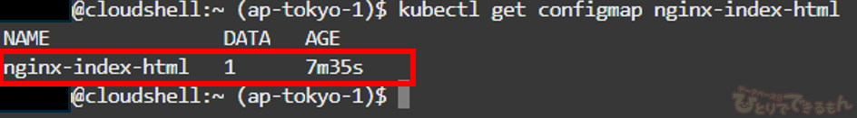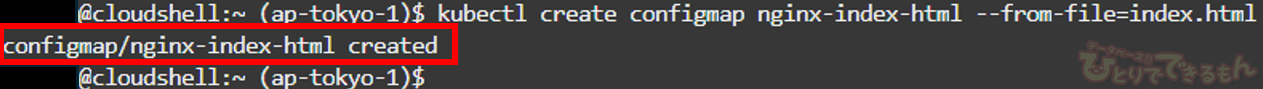 - 新規に作成したindex.htmlファイルディレクトリへ移動し、ConfigMap(コンテナ外から設定情報を渡すための、付箋のようなもの)を作成します。
