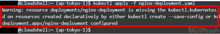 kubectl applyの初回実行時のみ警告メッセージ(Warning)が表示されますが、メッセージ内容には問題はなく、設定ファイルは正常に適用されます。$ kubectl apply -f nginx-deployment.yaml