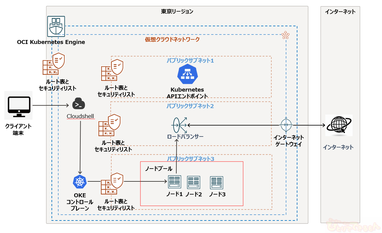 ざっくりとしたな例ではありますが、OCI Kubernetes Engineでは、このようなイメージ図で構成することが可能です。