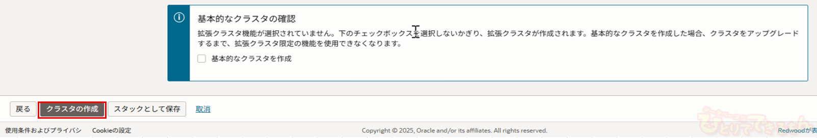 - 基本的なクラスタの確認:「基本的なクラスタを作成」はデフォルトでチェックを外した状態にします。