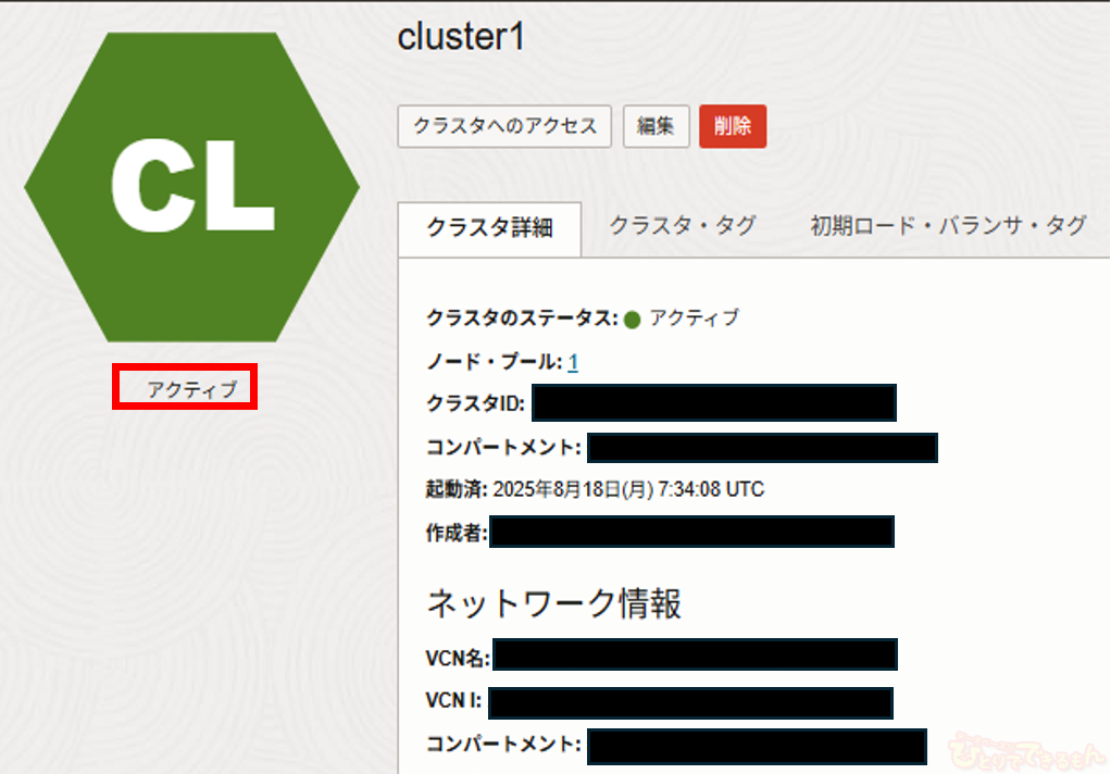 - クラスタの詳細画面に遷移されるので、作成中から「アクティブ」に表示されるまで待ちます。