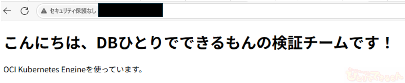 <!DOCTYPE html> <html> <head> <title>My First K8s App!</title> <meta charset="UTF-8"> </head> <body> <h1>こんにちは、DBひとりでできるもんの検証チームです!</h1> <p>OCI Kubernetes Engineを使っています。</p> </body> </html>