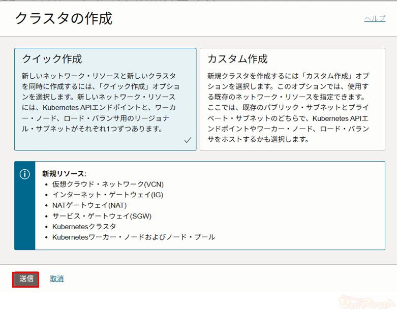 「送信」をクリックします。 - 名前、コンパートメント、Kubernetesバージョンを指定します。