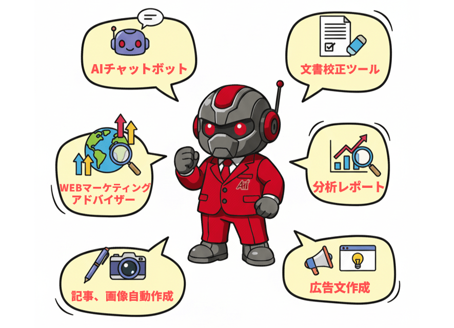 | ④文書校正機能 | 誤字脱字や文法チェックをAIが自動で対応。記事品質を高める必須ツール。 |