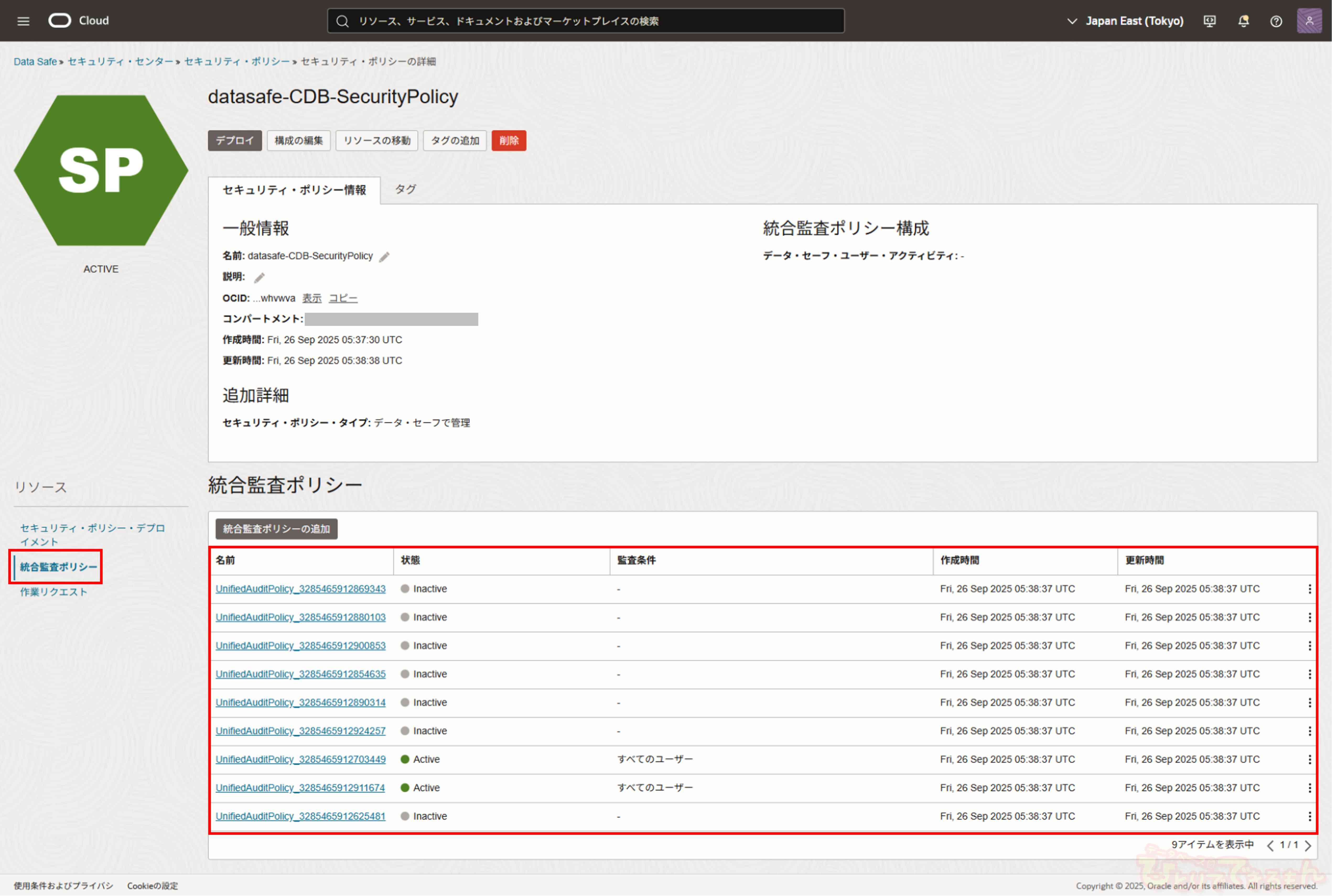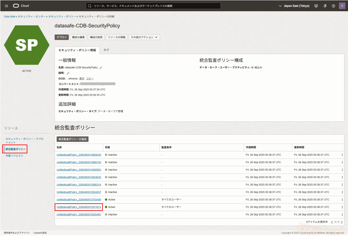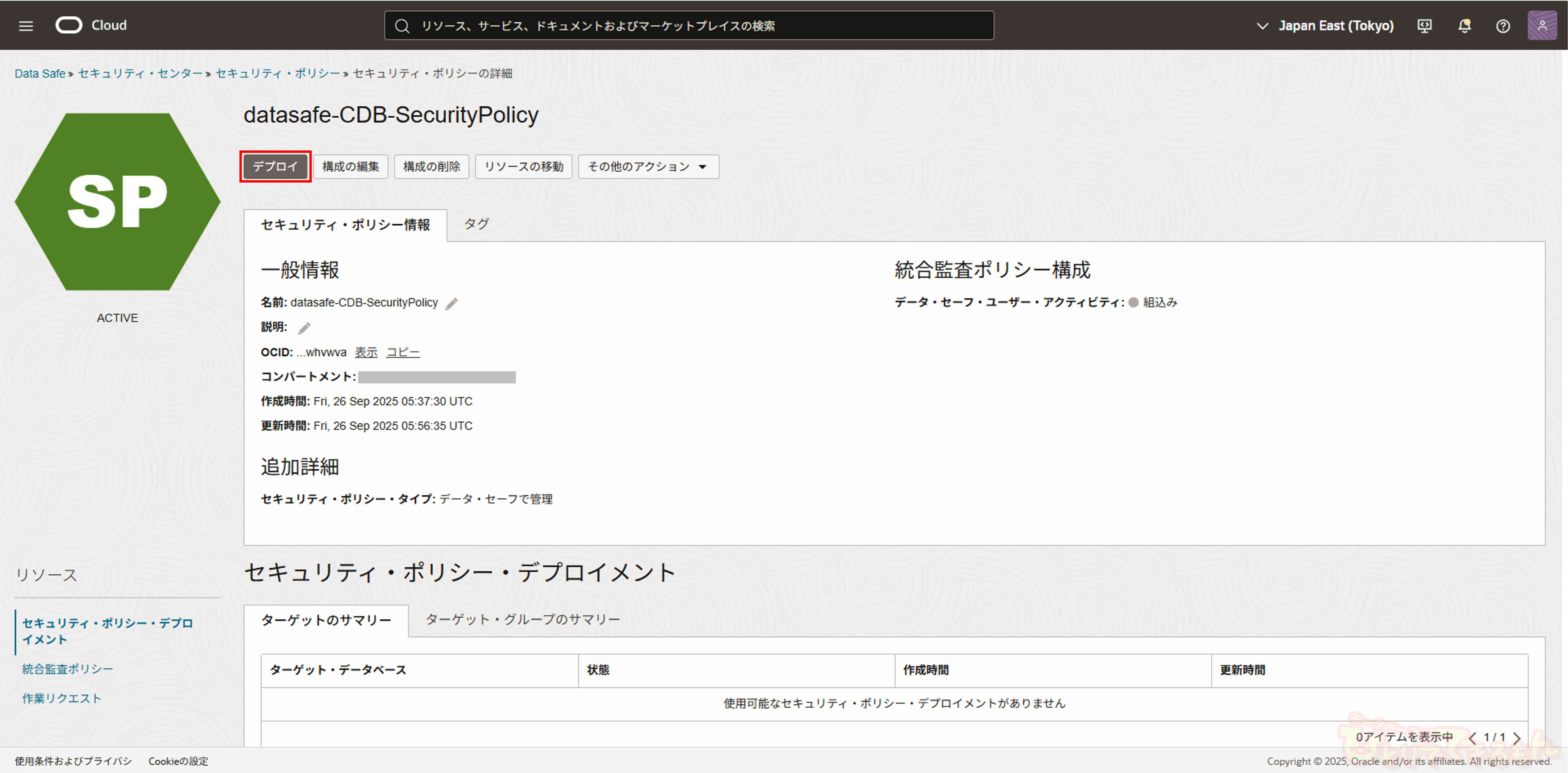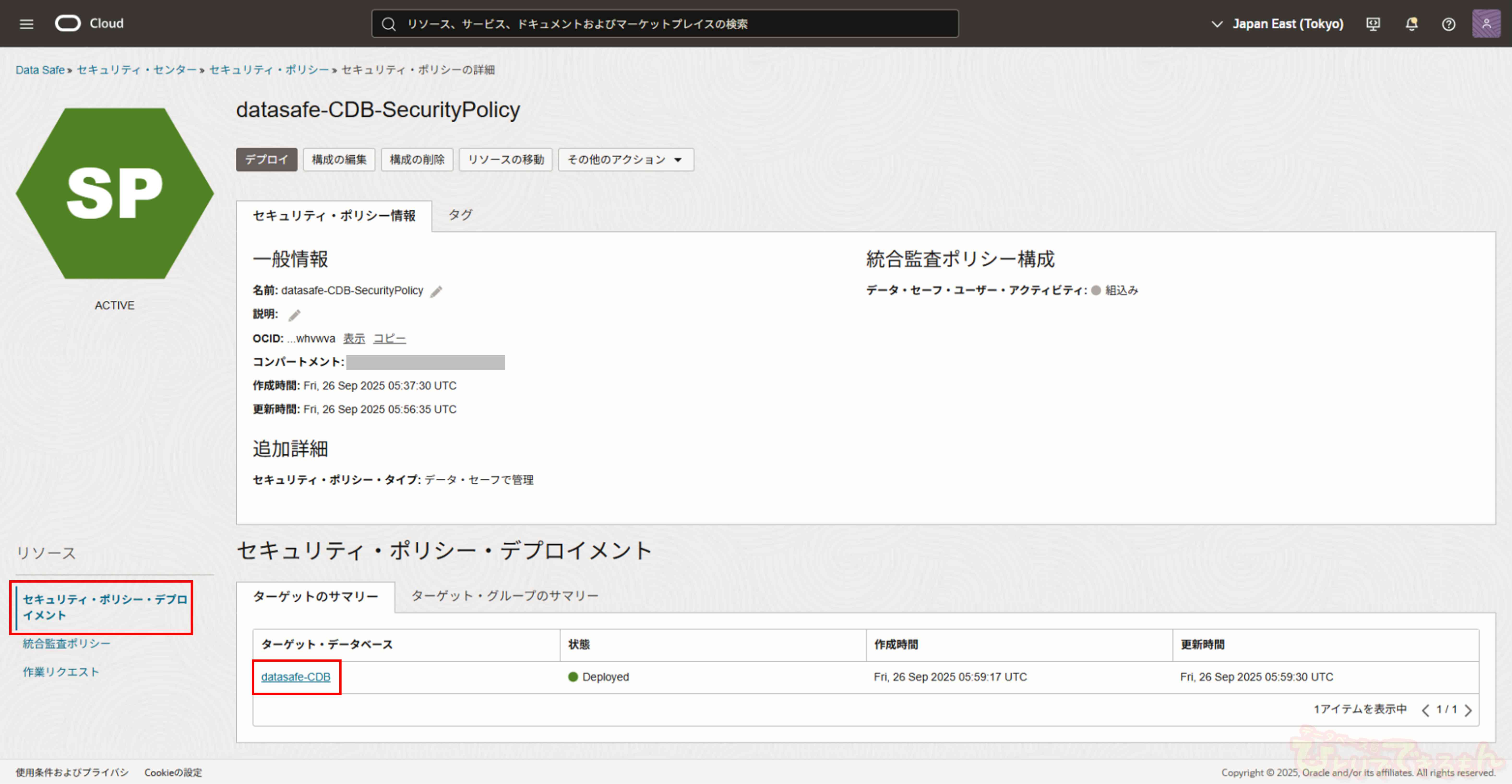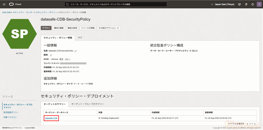 デプロイ完了後、セキュリティ・ポリシー詳細画面にてセキュリティ・ポリシー・デプロイメントとしてターゲット・データベースが表示されます。