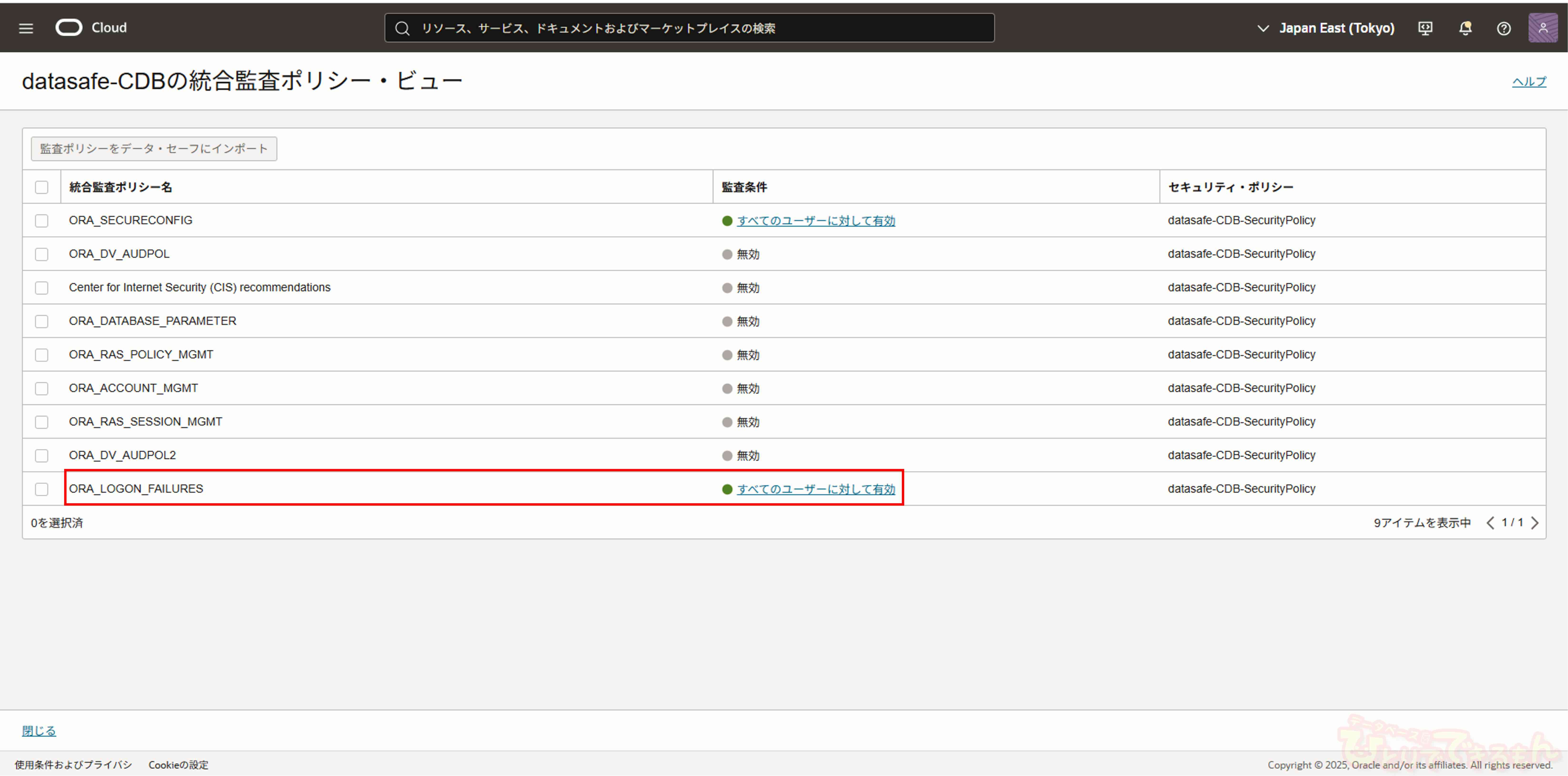 今回は、「ORA_LOGON_FAILURES」を「無効」に変更します。
