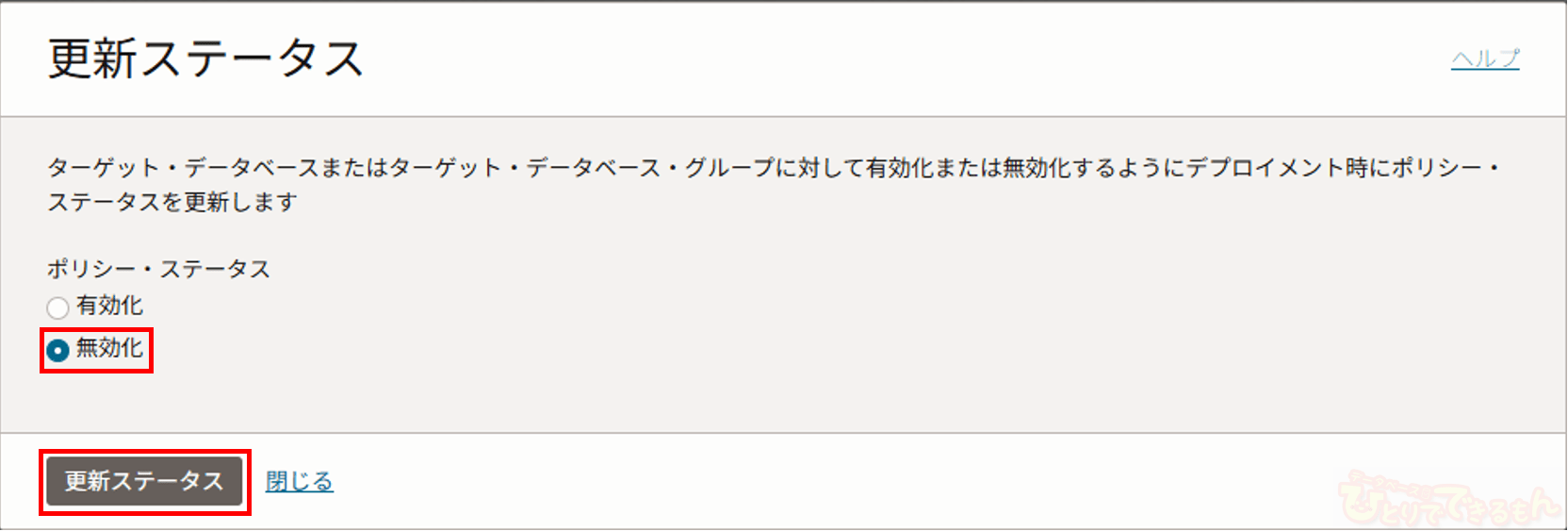 今回は、統合監査ポリシーを無効化するため、「更新ステータス」を選択します。