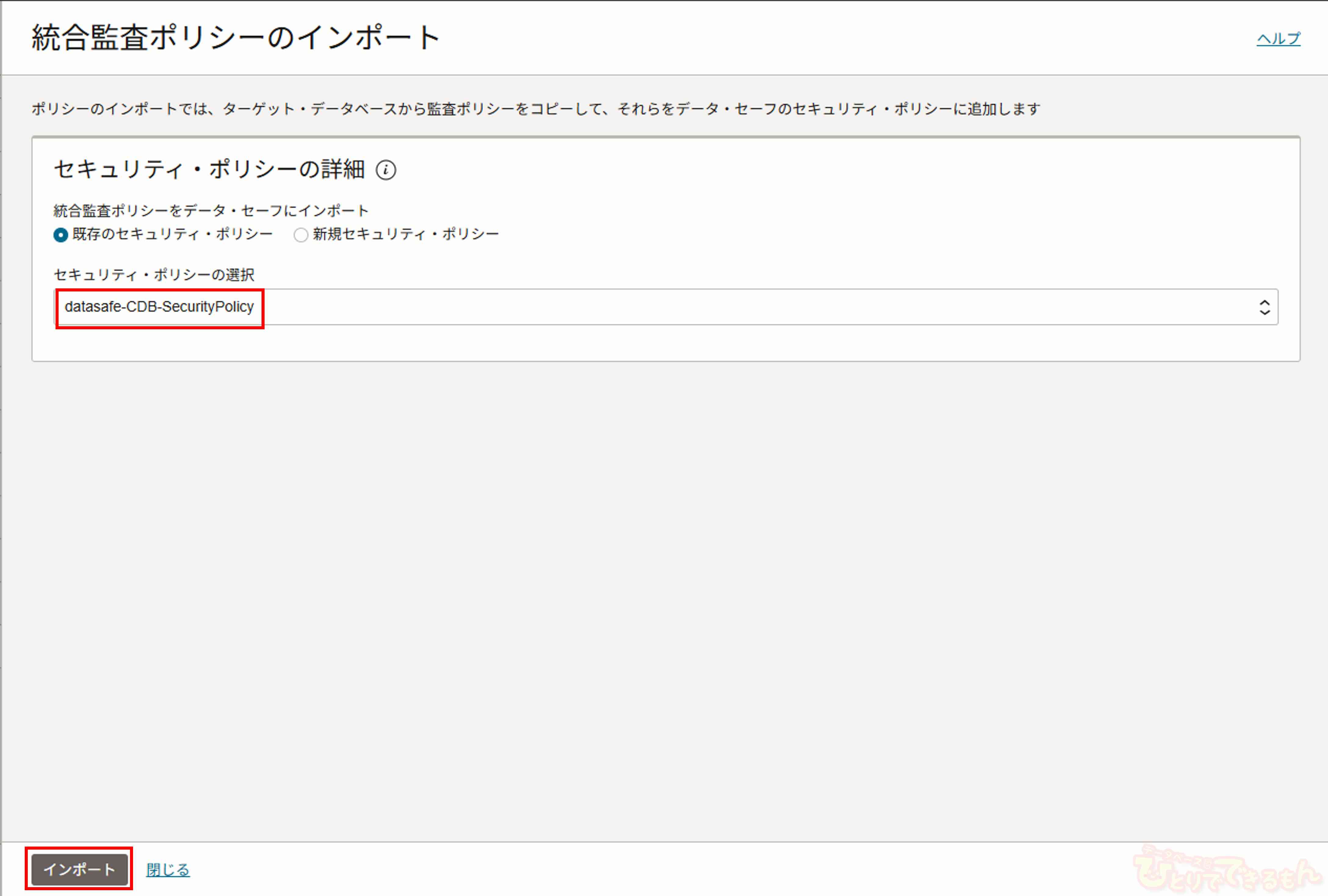 セキュリティ・ポリシーに追加する統合監査ポリシーを選択し、「監査ポリシーをデータ・セーフにインポート」を選択します。