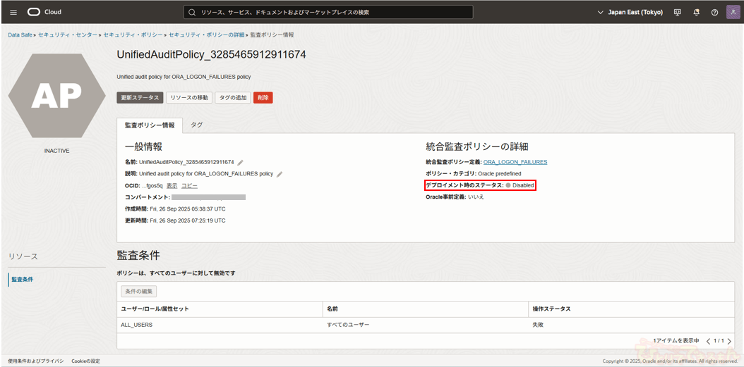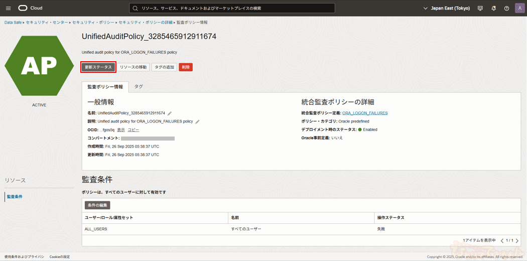 ※セキュリティ・ポリシーをデプロイしているターゲット・データベース・グループまたはターゲット・データベースが複数ある場合は、すべてに対してリフレッシュを実施します。※セキュリティ・ポリシー・デプロイメントのリフレッシュを実施してもステータスが「PENDING_DEPLOYMENT」となる場合は、セキュリティ・ポリシーの詳細画面から「デプロイ」し、セキュリティ・ポリシー・デプロイメントの詳細画面にてステータスが「DEPLOYED」であり問題が発生していないことを確認してから次のステップに進みます。 - 統合監査ポリシーの監査条件の変更確認