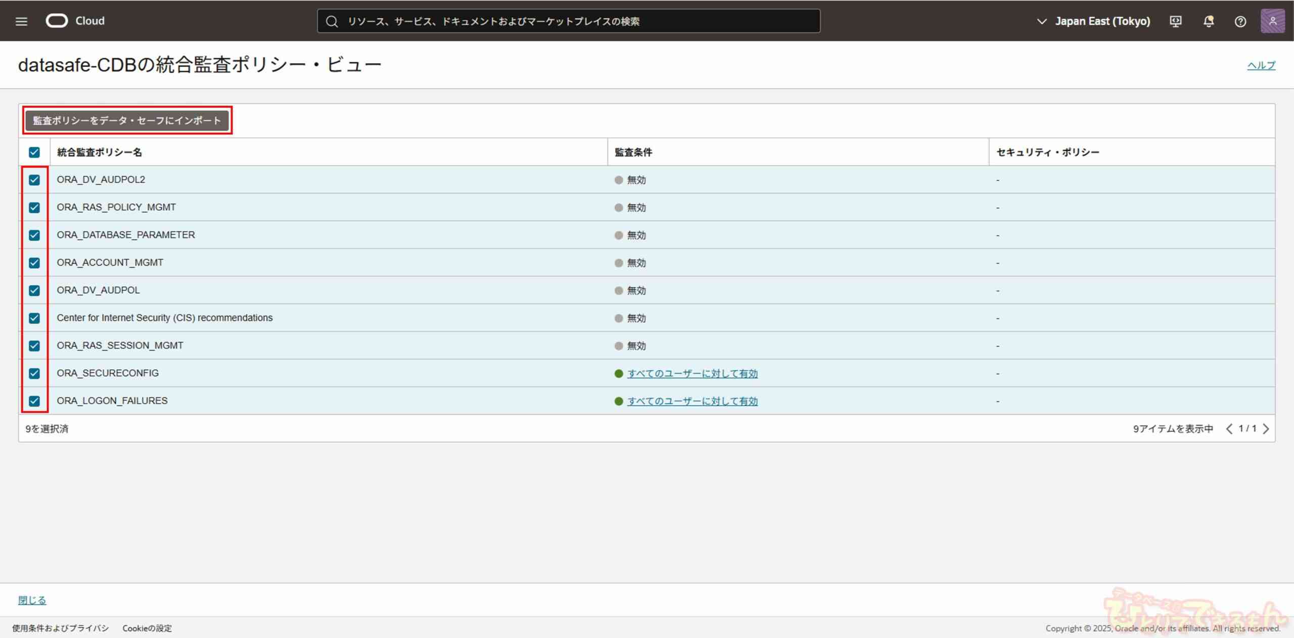 セキュリティ・ポリシーに追加する統合監査ポリシーを選択し、「監査ポリシーをデータ・セーフにインポート」を選択します。