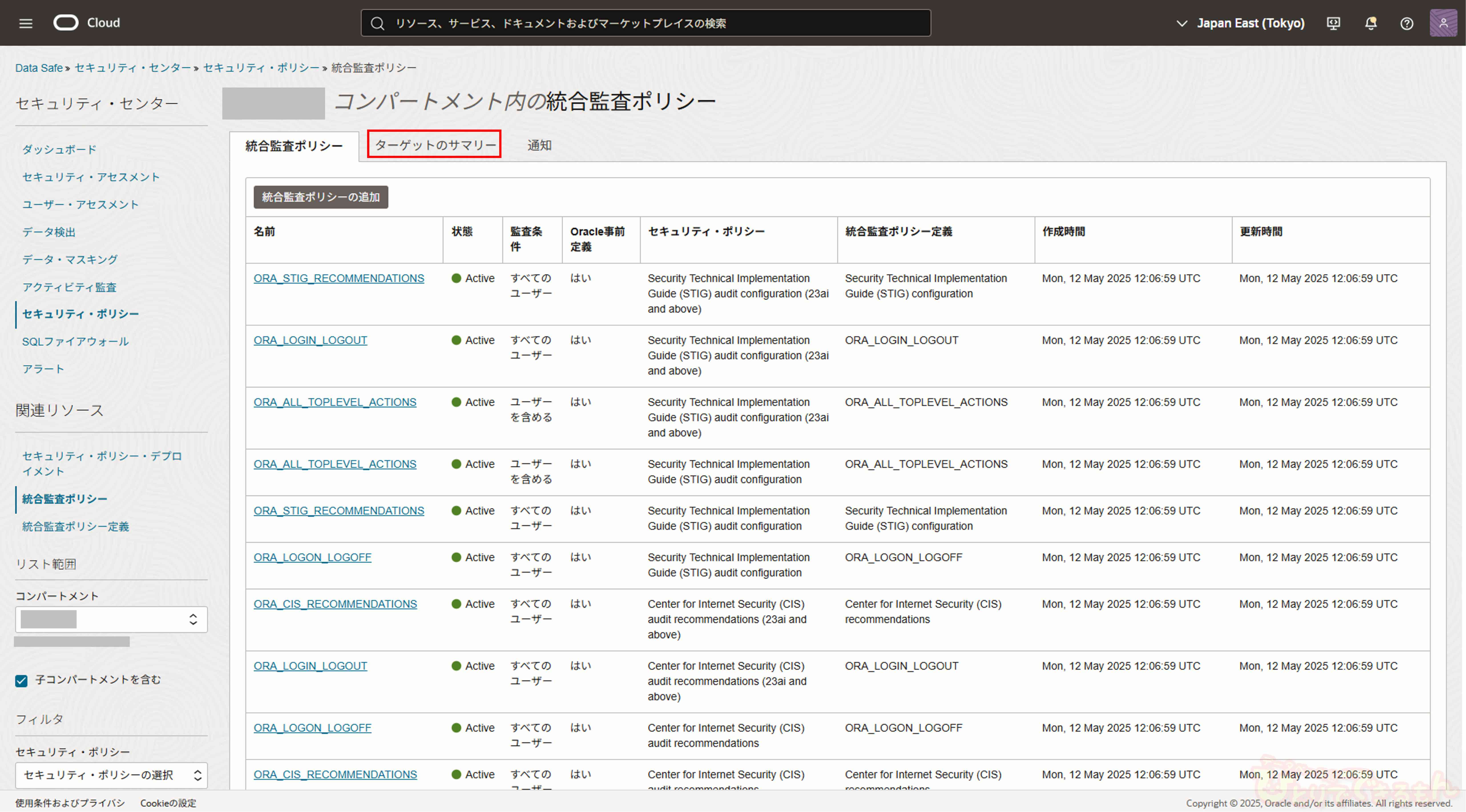 セキュリティ・ポリシーの画面に戻り、関連リソースの「統合監査ポリシー」を選択し、「ターゲットのサマリー」タブを選択します。