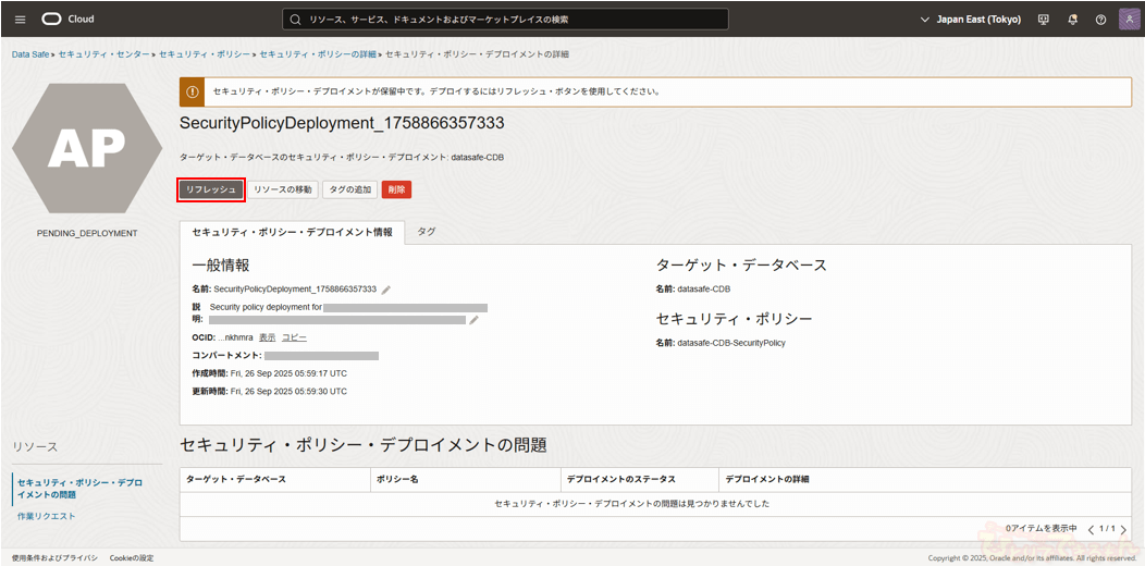 デプロイ完了後、セキュリティ・ポリシー詳細画面にてセキュリティ・ポリシー・デプロイメントとしてターゲット・データベースが表示されます。